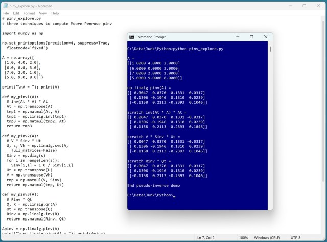 A Python demo explores 3 techniques for computing the Moore-Penrose pseudo-inverse. Each technique has pros and cons for different matrix sizes.