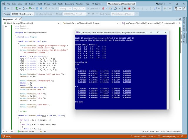 QR decomposition methods, including Householder, modified Gram-Schmidt, Givens, offer varying precision levels. Implementing QR decomposition with C# yields less precise but simpler results, suitable for machine learning scenarios.