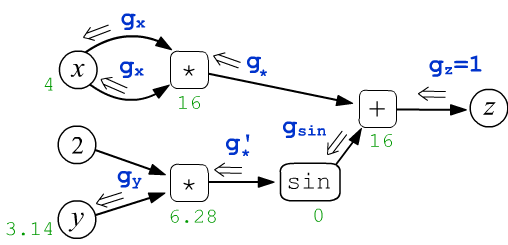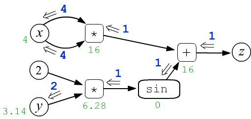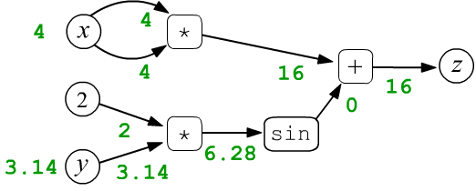 Let's consider the function $z=f(x,y)=x\cdot x + \sin(2 y)$ as a simple example of a function with two scalar variables $x$ and $y$. Let $x=4$ and $y=3.14159$. These numbers are assigned to the leaf nodes $x,y$ and then they are propagated through the computational graph from left to right. So, the multiplication node includes two arrows of each argument of the operation. In the first such node, they "carry" the same values $4$, which, when multiplied, gives the output value of $16$ (green color). As a result, each node, including the final one ($z=16$), takes on a certain value: