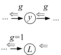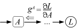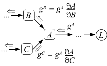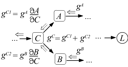 since by definition it is: $g=\partial L/\partial L =1$. - After passing through a node, the gradient is split along all the edges entering the node and multiplied by the derivatives between the nodes that the edge connects (see the left figure below).