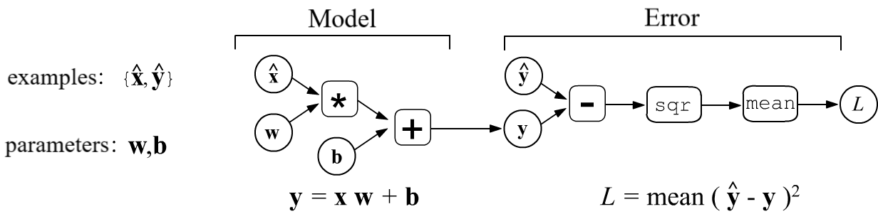 The model error depends on its parameters $L=L(\mathbf{w},\mathbf{b})$. Training the model involves searching for parameter values that minimize the error: $\mathbf{w},\,\mathbf{b} = \text{argmin}\,L(\mathbf{w},\,\mathbf{b})$. If there are many parameters, the most effective method is the gradient method and its various modifications. For a complex model, it is not easy to analytically calculate the gradient (derivatives with respect to the parameters). It is more convenient to represent the model as a computational graph. The graph has the topology of a tree. The root of the tree is the desired quantity (the error $L$), and he nodes perform elementary calculations. If the derivatives at each node are known, then the error gradient can also be found from the model parameters that are in the leaves of the tree. This approach is the basis of all modern machine learning frameworks.