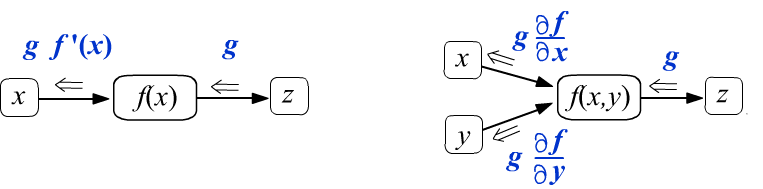 - If multiple gradients enter a node, they are summed (see the right figure below), which is a consequence of the rule for computing the derivative of a composite function (formula under the figure).