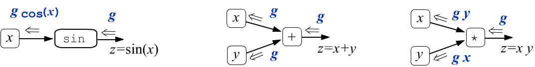 $$ Z_{ij...} = f(X_{ij...}),~~~~~~~~~~ g^{(\mathbf{X})}_{\alpha\beta...} ~=~ \sum_{i,j,...} g^{(\mathbf{Z})}_{ij...}~\frac{\partial f(X_{ij...})}{\partial X_{\alpha\beta...}} ~=~\sum_{i,j,...} g^{(\mathbf{Z})}_{ij...}~f'(X_{ij...})~\delta_{i\alpha}\delta_{j\beta}... ~=~ g^{(\mathbf{Z})}_{\alpha\beta...}~f'(X_{\alpha\beta...}). $$ The most popular functions in neural networks have the following derivatives: $$ \left\{ \begin{array}{rcl} y=\sigma(x)&=&\displaystyle\frac{1}{1+e^{-x}},\\[3mm] \sigma'(x)&=& y\,(1-y) \end{array} \right. ~~~~~~~~~~~~~ \left\{ \begin{array}{rcl} y=\tanh(x) &=& \displaystyle\frac{e^{x}-e^{-x}}{e^{x}+e^{-x}}\\[3mm] \tanh'(x) &=& 1-y^2 \end{array} \right. ~~~~~~~~~~~~~ \left\{ \begin{array}{rcl} y=\text{relu}(x) &=& \text{max}(0,\,x)\\[3mm] \text{relu}'(x) &=& \mathrm{0~if~x~<~0~else~1} \end{array} \right. $$It is slightly more complicated for functions that change the tensor's shape. For example, consider summing a tensor along the first index: X.sum(axis=0):