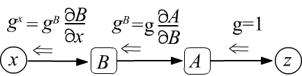 g^x ~=~ \frac{\partial z}{\partial x} ~=~ \frac{\partial A}{\partial x} ~=~ \frac{\partial A}{\partial B}\,\frac{\partial B}{\partial x},