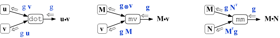 $$ z = \sum_i u_i\,v_i,~~~~~~~~~~~~~~ g^{(\mathbf{u})}_\alpha = g^{(z)}\, \displaystyle\frac{\partial z}{\partial u_{\alpha}} = g^{(z)}\,v_{\alpha}, $$and similarly for $g^{(\mathbf{v})}_{\alpha} $ Thus, during backpropagation, the scalar $g^{(z)}$ enters the dot node, and upon exiting it transforms into two vectors: $\mathbf{g}^{(\mathbf{u})} = \mathbf{g}^{(z)} \, \mathbf{v}$ and $\mathbf{g}^{(\mathbf{v})} = \mathbf{g}^{(z)} \, \mathbf{u}$.