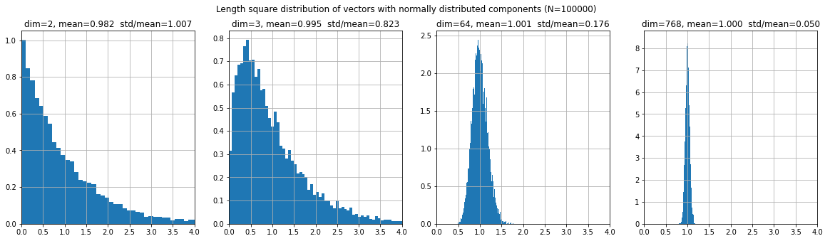 If the components of a vector are random Gaussian variables $\varepsilon$ with zero mean and unit variance, then the expected value of the squared length of the vector equals the dimensionality of the space: $$ \langle \mathbf{x}^2\rangle = \langle \varepsilon^2_1+...+\varepsilon^2_1\rangle = n. $$ At the same time, for large $n$ the probability distribution of the squared length $D=\mathbf{x}^2$ has a narrow peak in the neighborhood of $n-2$ (all points "concentrate" near the sphere):: $$ \frac{e^{-(\varepsilon^2_1+...+\varepsilon^2_n)/2}} {(2\pi)^{n/2}}\, d\varepsilon_1...d\varepsilon_n = \frac{\Omega_n}{(2\pi)^{n/2}}\, e^{-r^2/2}\, r^{n-1}\,dr = \frac{\Omega_n}{2(2\pi)^{n/2}}\, e^{-D/2}\, D^{n/2-1}\,dD $$ Let's simulate this using the numpy library: