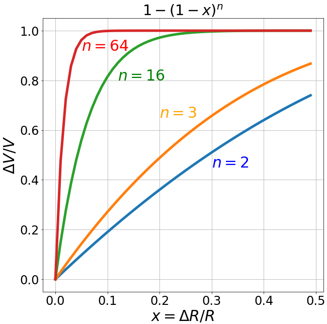\frac{\Delta V}{V} = \frac{R^n - (R-\Delta R)^n}{R^n} = 1 - \left(1-\frac{\Delta R}{R}\right)^n.