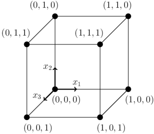 In an n-dimensional space: x = {x1,...,xn}. Let one vertex of the cube be at the origin: {0,0,...,0} (n zeros). The remaining vertices are enumerated by all possible sequences of n zeros and ones: {0,0,...,0}, {1,0,...,0}, ..., {1,1,...,1}, therefore: