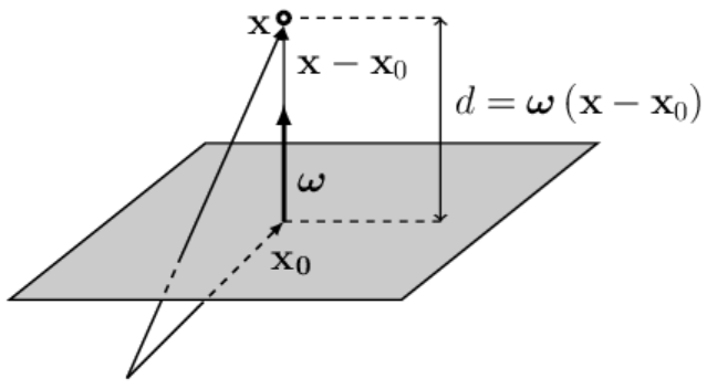 $$ d = \omega_0 + \boldsymbol{\omega}\mathbf{X},~~~~~~~~~~~~\omega_0 = -\boldsymbol{\omega}\mathbf{x}_0. $$Here $d > 0$ if the point $\mathbf{X}$ lies on the side of the plane toward which the vector $\boldsymbol{\omega}$ points, and $d < 0$ if it lies on the opposite side. When $d=0$, the point $\mathbf{X}$ lies on the plane. Changing the parameter $\omega_0$ shifts the plane parallel to itself in space. If $\omega_0$ decreases, the plane moves in the direction of the vector $\boldsymbol{\omega}$ (the distance becomes smaller), and if $\omega_0$ increases, the plane moves opposite to the direction of $\boldsymbol{\omega}$. This follows directly from the formula above.