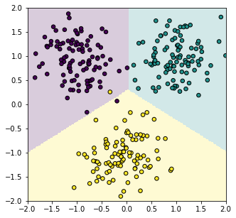 model.plot(-2, 2, -2, 2) plt.scatter(X[:,0], X[:,1], c=C, s=30, edgecolors='black') plt.show()
