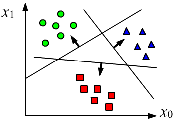 For clarity, consider a two-dimensional feature space $\mathbf{x}=\{x_0, x_1\}$ and three classes $c=\{0,1,2\}$, one of which the object must be assigned to. The model will have three outputs: $n_y=3$, for which we will require the target values for the first, second, and third classes respectively: $$ \mathbf{y}=\{+1,-1,-1\},~~~~~\mathbf{y}=\{-1,+1,-1\},~~~~~\mathbf{y}=\{-1,-1,+1\}. $$ We will still use the mean squared error, for which there is an exact solution. Of course, the linear model will not be able to achieve the target values for all examples. However, the three outputs of the model $\mathbf{y}=\{d_0,d_1,d_2\}$ are three signed distances from the point $\mathbf{x}$ to the three planes. Distances are positive if the normal vector "faces" the point and negative if it points in the opposite direction. The least squares method will try to rotate these vectors so that, at least, the signs of the model outputs match the target values. This will give the required classifier.