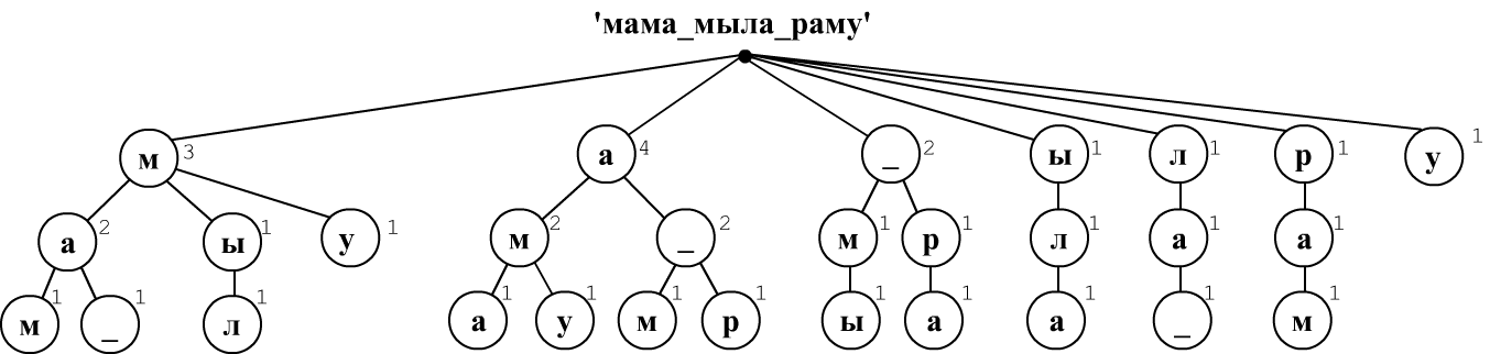 Suppose we restrict ourselves to trigrams (needed to compute joint probabilities $P(x_1,x_2,x_3)$ and conditional probabilities $P(x_1,x_2\Rightarrow x_3)$). We slide a window of three characters over the text, shifting it by one character each time. The first sequence "мам" produces the first branch of the tree root -> м -> а -> м. At each node, we record a count of one. The next sequence "ама" produces another branch emerging from the root. The third sequence "ма_" starts in the same way as the first branch, so its first two nodes increase the counters at "м" and "а", and the second node "а" then splits into two branches (for the characters "м" and "_").