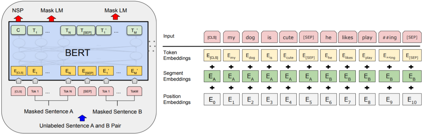 To the ordinary word embedding is added the embedding of its position in the sentence and the embedding of the sentence index (see the second figure below). All three embeddings have the same dimensionality, but different vocabularies. For example, the word-position vocabulary is the set of numbers 0,1,...,511, each of which is assigned its own E-dimensional embedding vector.