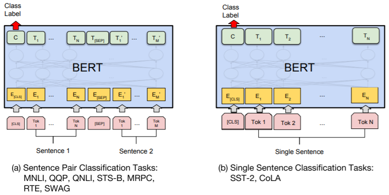 In the first illustration below (a), an example of fine-tuning for a classification task with two sentences S1 and S2 is shown. For instance, in the "Natural Language Inference" (NLI) task: S1 => S2, there are three classes: (entails, contradicts, neutral). Similarly, classification tasks with a single sentence are fine-tuned (shown in the second illustration b). For example, in the "Sentiment Analysis" task, the goal is to determine whether a review is positive or negative (one “sentence” and two classes). Naturally, a “sentence” in this context can actually consist of several linguistic sentences.
