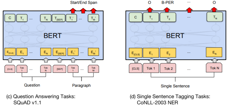 The third example (c) is related to the "Question Answering" (QA) task. For instance, in SQuAD v.1.1, a paragraph of text is followed by a question, the answer to which is a span of the input text. In BERT, the question is treated as sentence A, and the passage containing the answer is treated as sentence B. The only trainable parameters are two vectors $\mathbf{S}$ and $\mathbf{E}$ of dimensionality $E$. The probability $P_i$ that the word $\mathbf{T}_i$ in the text is the start of the answer is computed as $P_i = \text{softmax}(\mathbf{S}\mathbf{T}_i)$, and similarly, $P_j = \text{softmax}(\mathbf{E}\mathbf{T}_j)$ gives the probability that the token $\mathbf{T}_j$ is the end of the answer. During training, as usual, the logarithm of these probabilities is maximized, and during testing, the maximum of their sum is taken for $j > i$.