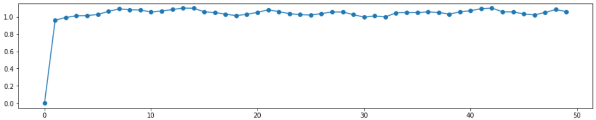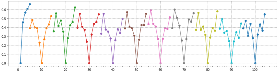 Let’s consider the properties of the word position embedding vectors. The zero value is reserved for the <CLS> token, and the words are numbered sequentially starting from one. Below are the cosine distances $1-\cos(\mathbf{v},\mathbf{u})$ of the nearest neighbors to the position vectors with indices 1,10,20,...100. Each vector (compared with itself) corresponds to a zero value (the minima of the graph):