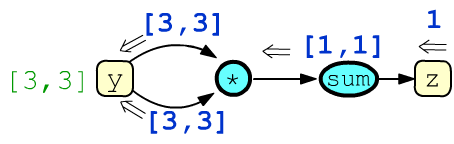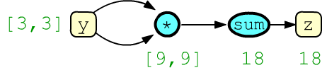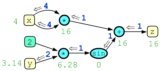 Recall that a computational graph is a sequence of operations used to obtain the value of some quantity. In machine learning, this is usually a scalar loss function (a zero-dimensional tensor). The result of computation is obtained during the forward pass through the graph. Below is a graph for the function $z = x\cdot x + \sin(2\cdot y)$ along with the node values (green color) at x=4 and y=3.14159265: