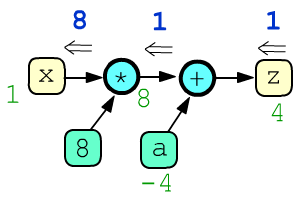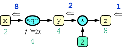 After the forward pass through the graph (from the leaves to the root $z$ of the tree), the backward pass procedure is launched, which computes the derivatives (gradients, blue color) of the target expression $z$ with respect to other nodes in the graph. In the illustration, the node z outputs $g_z=1$. The total $g_x=8$ entering node x equals the partial derivative $\partial z/\partial x$, and $g_y=2$ entering y equals $\partial z/\partial y$. For more details on gradient computation, see the document "Computational Graph".