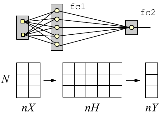 self.fc2 = nn.Linear(nH, nY) # in fully connected layers