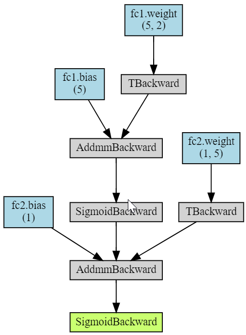 Finally, the torchviz library allows you to visualize the computational graph of the model (image on the right):
