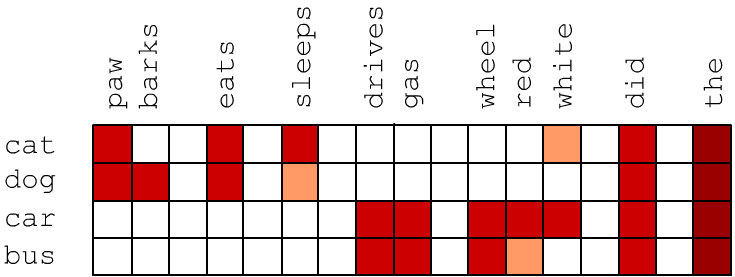 Semantic similarity between two words implies that in texts they occur in similar contexts, i.e. on average they are surrounded by the same words. Let's first consider vectors of dimensionality E_DIM equal to the number of words V_DIM in the vocabulary (E=V). Let the j-th component of the vector of the i-th word be proportional to the frequency $u_{ij} = P(w_i,w_j)$ of joint occurrence of words $w_i$ and $w_j$ in the same sentence. Semantically close words may not necessarily appear in the same sentence, but they share similar contexts and therefore have similar vectors. Below, high values of $P(w_i,w_j)$ are schematically highlighted in red. It is clear that the vectors of cat and dog are similar and differ from the vectors of car and bus: