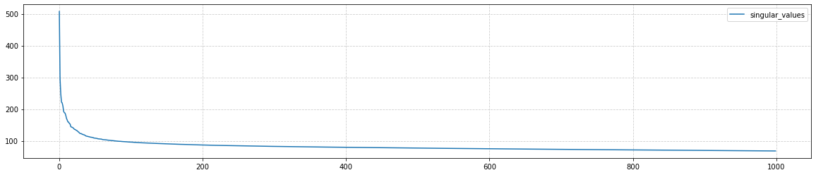 from sklearn.decomposition import PCA pca = PCA() res = pca.fit_transform(vecs)Computing principal components for a matrix of size (10000, 10000) takes about 7 minutes. The first 50 eigenvalues of the covariance matrix (pca.singular_values_) decrease rapidly, and then the decay toward zero (at i=V) becomes almost linear:
