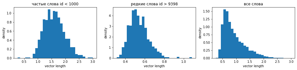 Let's construct histograms of vector length distributions separately for frequent words (the first 1000), rare words, and all words together. Frequent words have longer vectors, which is typical for all embedding methods: