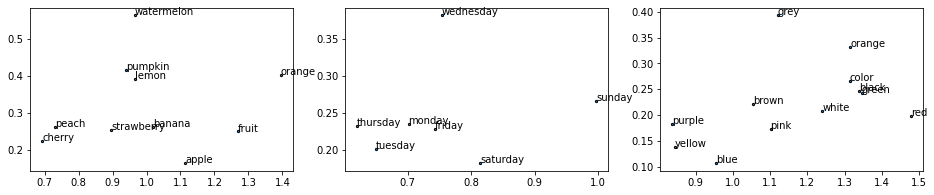 For comparison, cosine and Euclidean distances between these words: