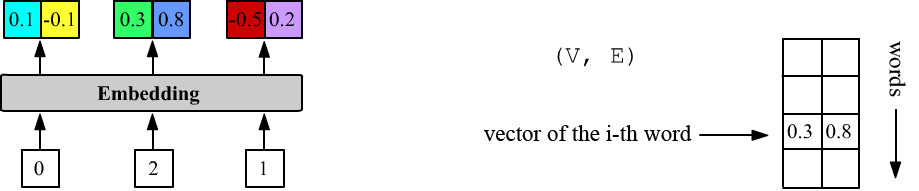 Above, VEC_DIM = 2 and the layer has three inputs (inputs = 3). The first word has index 0, the second 2, and the third 1. The Embedding layer stores a matrix of shape (DIC_SIZE, VEC_DIM), from which, given an input number i, it outputs the i-th row.