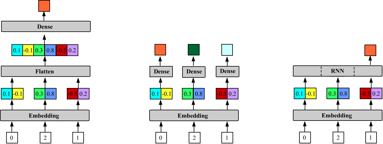 Unlike the Dense layer, recurrent layers expect vectors at their input, so the Embedding layer is connected to them directly (the third figure above):