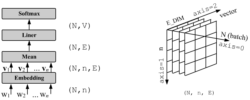 $$ \text{N} \left\{ \phantom{ \begin{array}{} \\ \\ \\ \\ \end{array} } \right. \overbrace{ \underbrace{ \begin{array}{|c|c|c|} \hline u_1 & u_2 & u_3 \\ \hline ~ & ~ & ~ \\ \hline ~ & ~ & ~ \\ \hline ~ & ~ & ~ \\ \hline \end{array} }_ {\mathbf{u}} }^ {\displaystyle\mathrm{E}} ~~~ \cdot ~~~ \text{E}\left\{ \phantom{ \begin{array}{} \\ \\ \\ \end{array} } \right. \overbrace{ \underbrace{ \begin{array}{|c|c|c|c|c|} \hline ~ & ~ & w_{i1} & ~ & ~ \\ \hline ~ & ~ & w_{i2} & ~ & ~ \\ \hline ~ & ~ & w_{i3} & ~ & ~ \\ \hline \end{array} }_ {\mathbf{W}^\top} }^ {\displaystyle\mathrm{V}} ~~~~~~=~~~~~~ \text{N} \left\{ \phantom{ \begin{array}{} \\ \\ \\ \\ \end{array} } \right. \overbrace{ \underbrace{ \begin{array}{|c|c|c|c|c|} \hline ~ & ~ & \mathbf{u}\mathbf{w}_i & ~ & ~\\ \hline ~ & ~ & ~ & ~ & ~\\ \hline ~ & ~ & ~ & ~ & ~\\ \hline ~ & ~ & ~ & ~ & ~\\ \hline \end{array} }_{\mathrm{softmax}~~ \Rightarrow~~ p_i} }^ {\displaystyle\mathrm{V}} $$The matrix of vectors is stored in model[0].weight, and the output layer matrix in model[2].weight. After training is completed, in order not to lose the information contained in matrix $\mathbf{W}$, you can average the vectors from the Embedding and the Linear matrix: