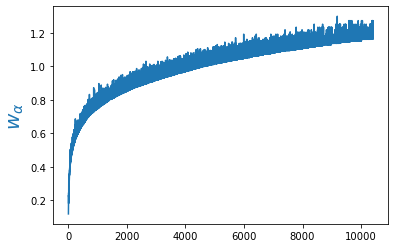 As weights we could, for example, take the negative logarithm of the word probability in the corpus: $w_\alpha=-\log p(w_\alpha)$.