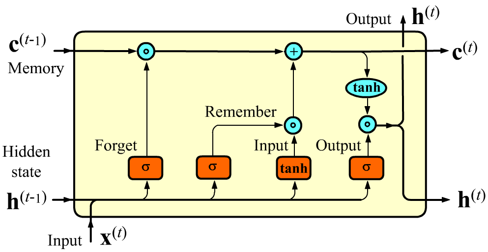 Inside an LSTM cell, instead of a single neural-network layer (as in SimpleRNN), there are four layers. The sigmoid layers $\sigma$ produce output vectors with values in $[0...1]$, and the hyperbolic tangent $\tanh$ produces values in $[-1...1]$.