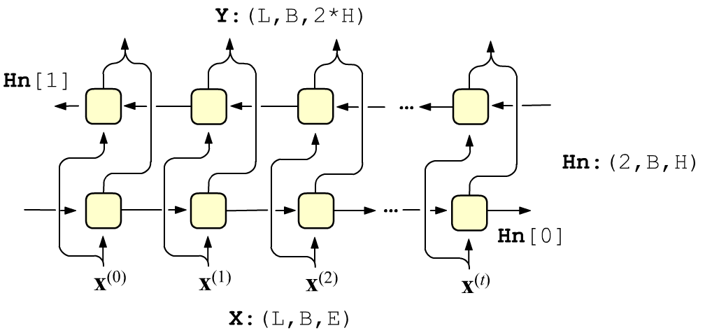 In this case it is appropriate to use two recurrent layers together, in the first of which the hidden states propagate from left to right, and in the next layer - from right to left. The input vectors are fed independently to each layer, and their outputs are concatenated. The cell weights of each layer are different.