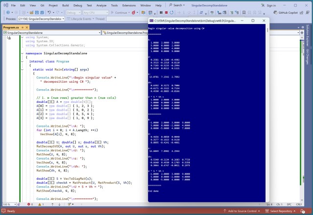 Реализация сингулярного разложения (SVD) в C# для матричной алгебры. SVD используется в алгоритмах машинного обучения, таких как линейная регрессия.