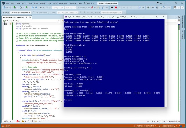 Разработчик применил набор данных по диабету к регрессионной модели на основе дерева решений на языке C#, что выявило низкую точность прогнозирования из-за крайней степени переобучения. Нормализация данных и параметров модели сыграла ключевую роль в достижении результатов, сопоставимых с результатами, полученными с помощью класса DecisionTreeRegressor из библиотеки scikit.