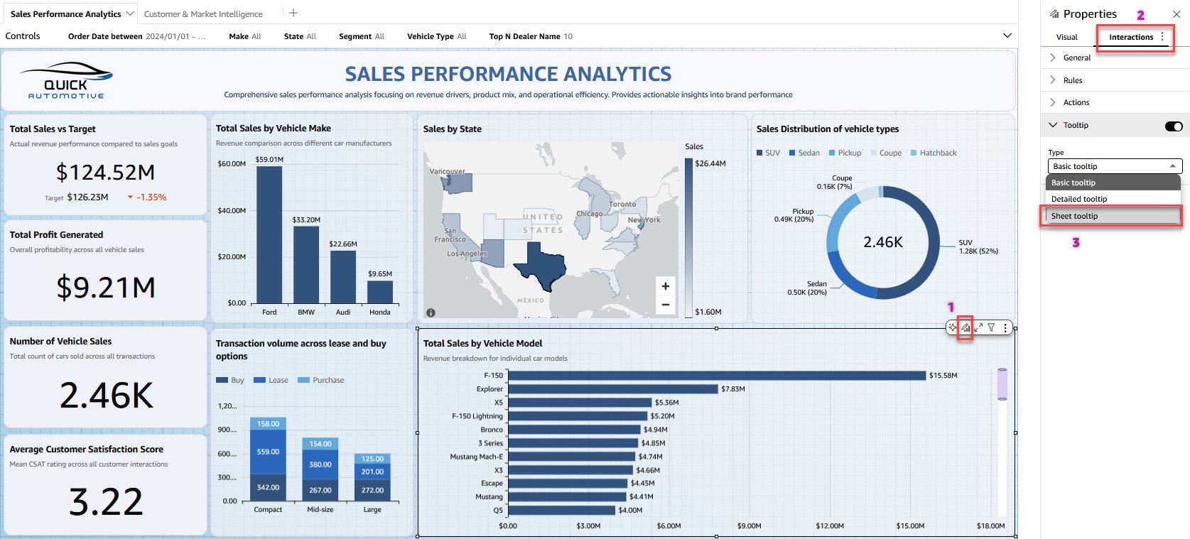 Amazon QuickSight представляет всплывающие подсказки для листов, что позволяет авторам информационных панелей создавать собственные макеты подсказок с использованием различных визуальных компонентов. Эта функция улучшает визуализацию данных, предоставляя динамическую информацию в режиме реального времени при наведении курсора, что повышает общее качество пользовательского опыта и эффективность...