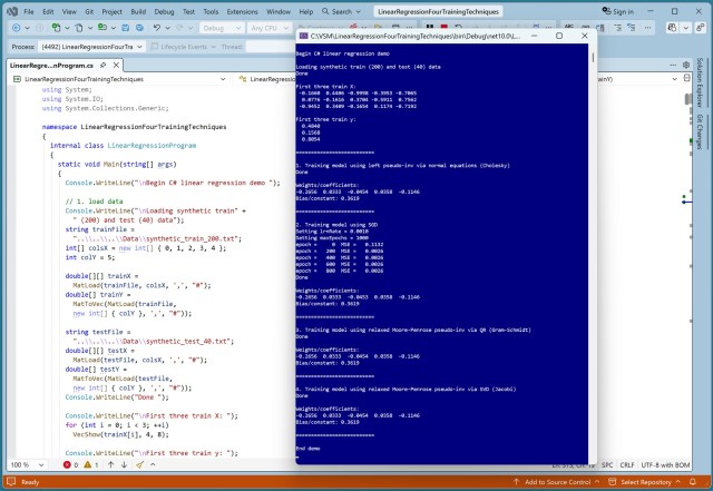 В статье журнала Microsoft Visual Studio Magazine за апрель 2025 года демонстрируется линейная регрессия вектора поддержки с помощью C# с эволюционным обучением. Линейная SVR наказывает промахи и сохраняет небольшие значения модели, но более популярны простые методы, такие как регрессия L1 и L2.