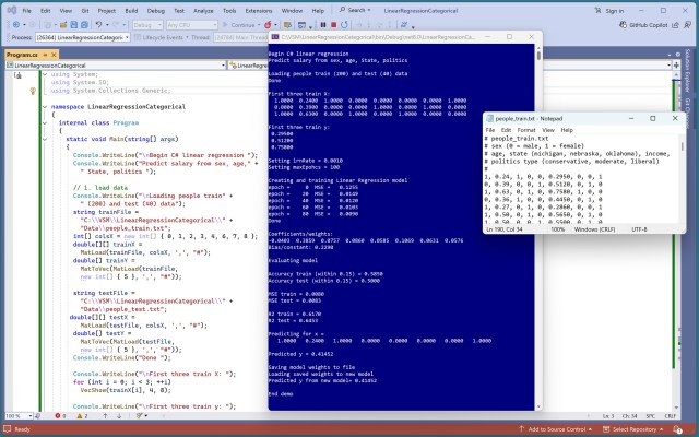 Впровадження лінійної регресії C# для прогнозування заробітної плати залежно від статі, віку, штату, політичних поглядів з використанням одноразового кодування та базового SGD. Досягнуто 91,5% точності навчання та 95,0% точності тестування з MSE 0,000671.