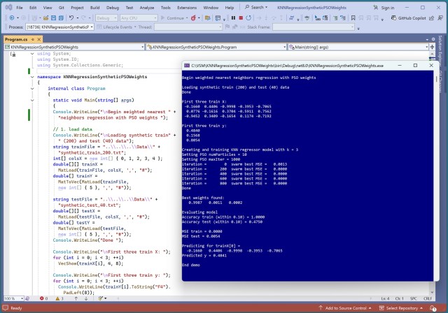 Стаття демонструє лінійну регресію опорних векторів за допомогою C# з навчанням рою частинок для оцінки точності прогнозування моделі. Демонстрація розкриває проблеми прогнозування нелінійних даних, підкреслюючи важливість спеціалізованих алгоритмів оптимізації, таких як рій частинок.